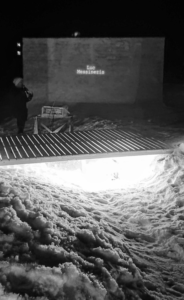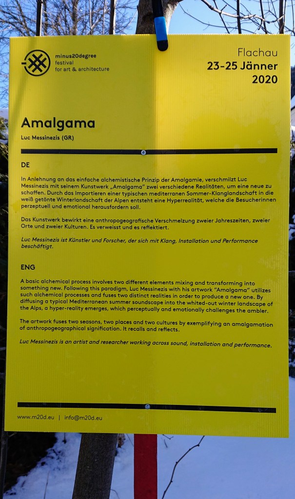 The original land art / sound art installation Amalgama was presented as part of the minus20degree Festival for Art & Architecture in Flachau, Austria. The festival was themed Global Village. Amalgama is an experiential land intervention fusing two distinct realities into a new hyper-reality. In simple words, one can hear cicada song while strolling around bushes and trees of the whited-out by snow winter landscape of the Alps. The message derives from what the wonderer is experiencing. It is a reality that does not exist yet there it is.