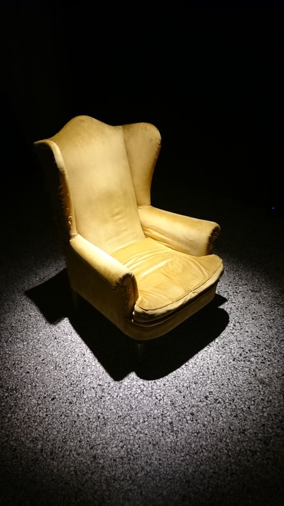 When the visitor sits on the armchair a set of concrete sound recordings from the region of Israel and Palestine are diffused by a matrix of 8 active loudspeakers. Each loudspeaker corresponds to one sound, following the choroechoic composition technique proposed by the artist’s research.
